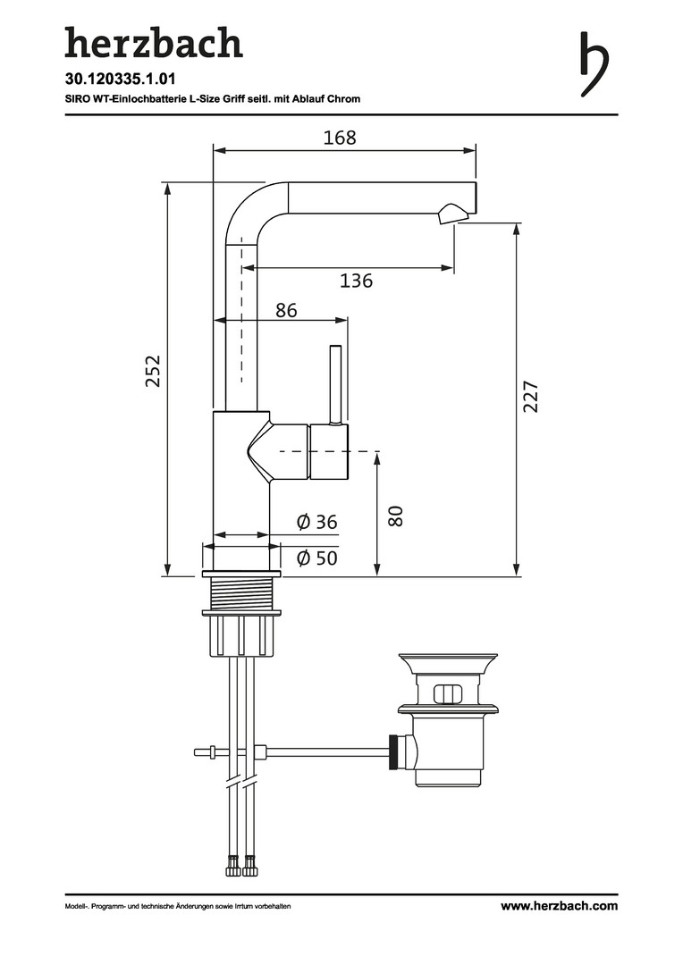 Herzbach Waschtisch-Einhebelmischer Siro L-Size mit schwenkbarem Auslauf 227cm, mit Ablaufgarnitur, chrom