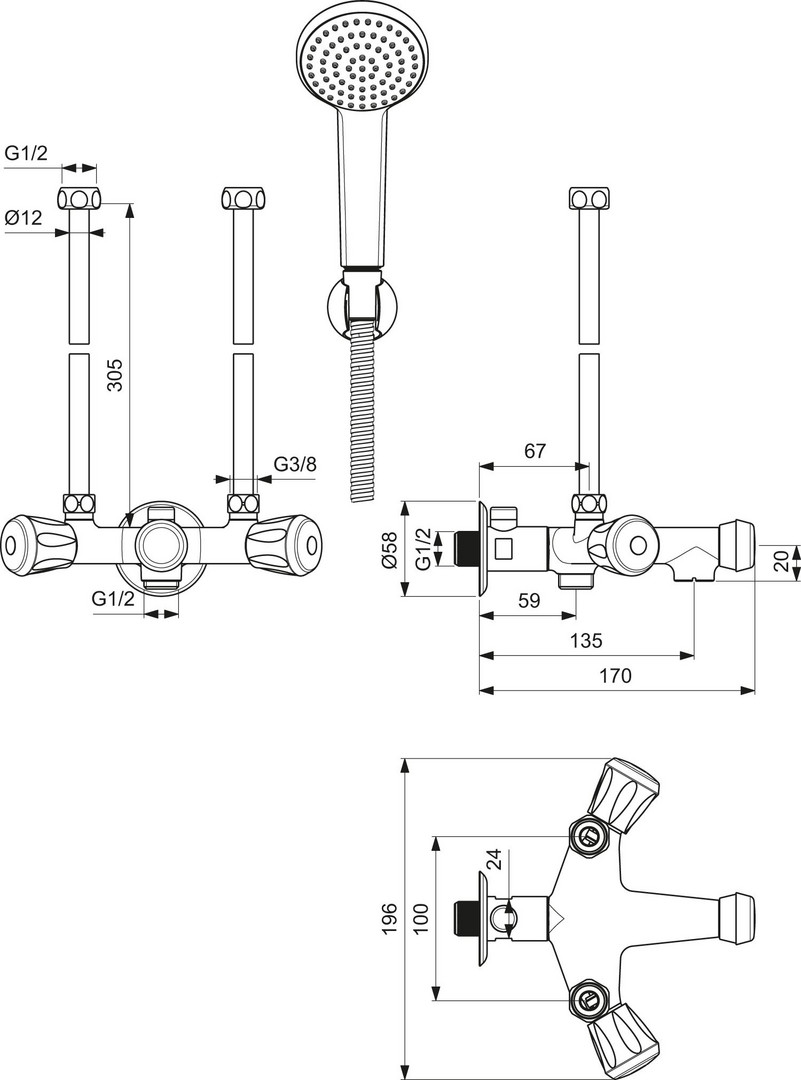 DN 15, 1-Funktionshandbrause, Kunststoff-Rohrhaken und Brauseschlauch 1250 x Ø 12 mm, Ausladung 135 mm, Anschlussgewinde G 1/2, Brauseanschluss G 1/2, Umschaltung für Brausegarnitur, Gummioberteile G 3/8, Kombiventil 40 mm