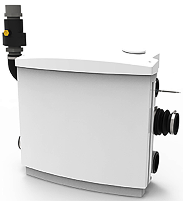All-In-One-Gerät, für die Entsorung von fäkalienfreien Abwässern oberhalb und unterhalb der Rückstauebene, für Grauwasser und aggressive Medien, für wässrige Lösungen bis 15% Salzgehalt, Vorwandinstallation oder Direktanschluss, steckerfertig, Spüleinrichtung gegen Ablagerungen im Behälter, integrierte Alarmanalge für niveauabhängigem Alarm, wartungsfreundlich, bestehend aus Kunststoffbehälter (ABS) mit eingebauter Pumpe (U3KS Spezial-Variante, vertikal einstufig), anschlussfertig mit Leitung und Stecker, Verbindungsmanschetten, Abgangskrümmer, Rückschlagklappe 1 1/4", Übergangsnippel, Behälterlüftung mit Aktivkohlefilter, Schellen und Befestigungsmaterial, freier Durchgang 10 mm, Kugellager fettgeschmiert, Wellendirchtring motorseitig, mit Ölkammer, SiC Gleitringdichtung mediumseitig, Welle und Motorgehäuse aus Edelstahl, überflutbar, Druckabgang DN 32, Behältervolumen 19 l, Gewicht 7 kg, Spannung 1/N/PE 230V, Strom 1,4 A, Leitung 4 m H07 RN-F-3G1,0, Schutzart IP 68, Isolierstoffklasse F, Motorschutz in der Wicklung, Schutzkontaktstecker