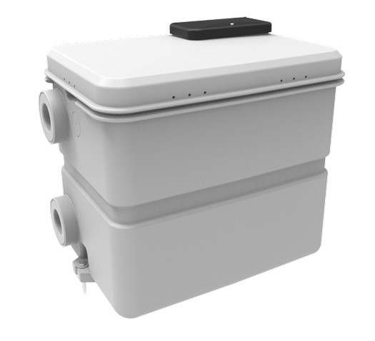 aus PE zur Aufnahme einer Schmutzwasserpumpe vom Typ U3KS, U5KS, U3KS spezial, U6K ES/DS, US 62 ES/DS, US 102 ES/DS, US 73 ES/DS oder US 103 ES/DS, für die Entsorgung von fäkalienfreiem Abwasser oberhalb und unterhalb der Rückstauebene ausgelegt, z.B. Wasser aus Waschmaschinen und Waschtischen, Schmutzwasser aus Gewerbebetrieben und Kondensat aus Gas-Brennwertkesseln, Entsorgung einer ebenerdig aufgebauten Duschtasse ist mit der U3KS in Verbindung mit einem Sonderschwimmer für niedrige Schalthöhen möglich, Behälter ist ausgerüstet mit 4 seitlichen Kombizuläufen DN 100/DN 50, davon 2 auf niedrigem Niveau zum Anschluss einer Duschtasse, Auftriebssicherung, Pumpenarretierung, zwei Griffmulden, Behälterdeckel mit vormontierter Dichtung und Schnappverschluss, ohne Werkzeug demontierbar, Abdeckung für geruchdichte Kabeldurchführung mit Zugentlastung der Leitung und Lüftungsventil mit Aktivkohlefilter, alle erforderlichen Teile der Behälterdruckleitung lose beigefügt, mit elastischer Verbindung für schalldämmenden flexiblen Anschluss sowie Schnellverschraubung zur werkzeuglosen Demontage der Pumpe, Druckleitung nicht vormontiert, zur optimalen Anpassung an Einbauverhältnisse vor Ort, Druckabgang am Behälter ist beidseitig vorzentriert, Ausführung als Gewindenippel 1 1/2'', außerdem im Lieferumfang Steckdichtung DN 50, Verbindungsmanschette DN 100 aus EPDM mit 2 Rohrschellen 4'', und Rückschlagklappe DN 40 mit 2x IG 1 1/2'', Alarmanlage und Waschmaschinenstopp als Zubehör erhältlich, mit Akku auch netzunabhängig, Behältervolumen ca. 75 l, 500 x 570 x 390 mm, Gewicht ca. 8,6 kg