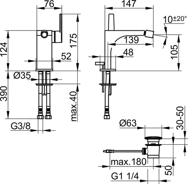 Auslaufhöhe 105 mm, Einlochmontage mit Schnell-Montage-System, Anschlussart Anschlussschläuche G 3/8, Mischwasserkartusche mit keramischen Dichtscheiben, Kugelgelenk Strahlregler M 18,5 x 1, Strahlwinkel +/-20° verstellbar, Durchflussmenge begrenzt auf 7,6 l/min, für Durchlauferhitzer geeignet, geräuschgeprüft
