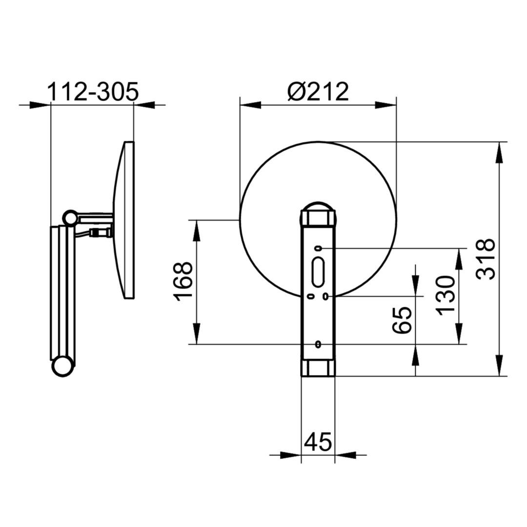 Wandmodell, rund, mit UP-Kabelführung, IP24, 6500 Kelvin (Tageslicht), an dreidimensional verstellbarem Schwenkarm, Spiegel einseitig, Vergrößerungsfaktor x 5, Bedienung über Raumlichtschalter (nicht im Lieferumfang enthalten), Stromversorgung: Netzanschluss über Wandanschlussdose, 12 V UP-Netzteil, Eingangsbereich 220~240 V, UP-Netzteil und Niedervolt-Verbindungskabel (500 mm) sind im Lieferumfang enthalten, Beleuchtung LED 4,5 Watt