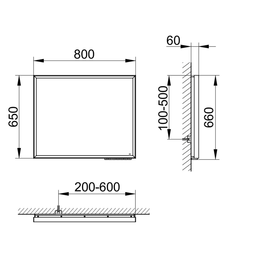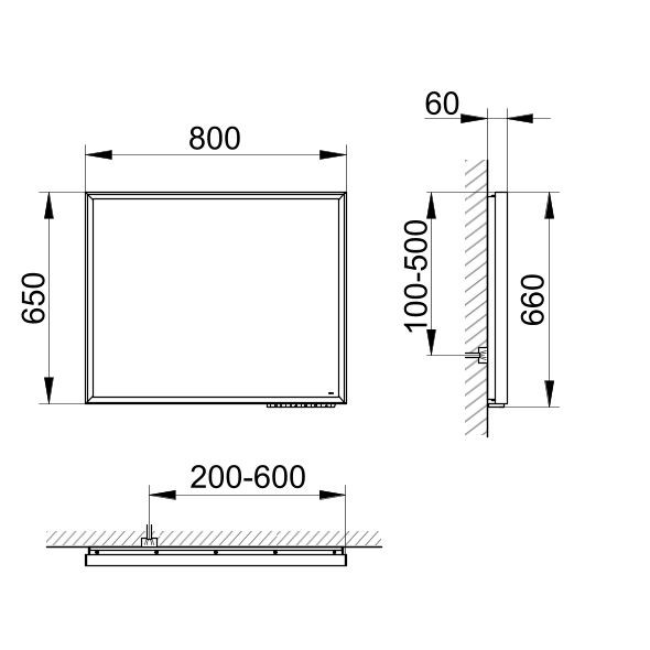 umlaufender Rahmen Aluminium, Bedienfeld mit kapazitiver Toch-Sensorik, Funktionen ein-/ausschalten, stufenlos dimmbar, Einstellen der Lichtfarbe, integrierte Nebenstellenfunktion (Raumschalter), Beleuchtung 2700 Kelvin (warmweiß) bis 6500 Kelvin (tageslichtweiß), Rahmen- und Waschtischbeleuchtung, LED 48/50/53/57/60/62/70/77 W, Spiegelheizung mittig platziert, optische Anzeige der Aufheizphase, automatische Abschaltung nach 20 Minuten