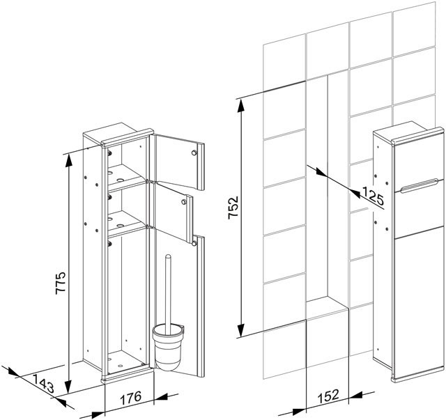 Wandmontage Unterputz, Papierrollenhalter, Rollenbreite bis 120 mm, Fach für Toilettenpapier-Ersatzrolle, Toilettenbürstengarnitur, herausnehmbarer Behälter, Einbaukorpus aus verzinktem Stahlblech, Einbautiefe 125 mm, verdeckte Befestigung, mit Befestigungs-Set und Ersatzbürstenkopf