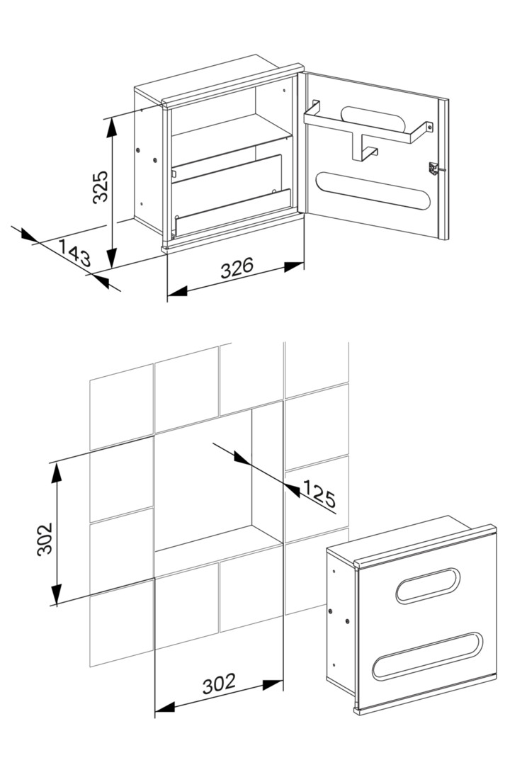 für gefalzte Papiertücher (z-Faltung) geeignet (250 x 230 mm), Aufnahme für Kleenexbox, Betätigung von vorne, Befüllung durch abschließbare Fronttür, Einbaukorpus aus verzinktem Stahlblech, Einbautiefe 125 mm, verdeckte Befestigung, mit Befestigungs-Set