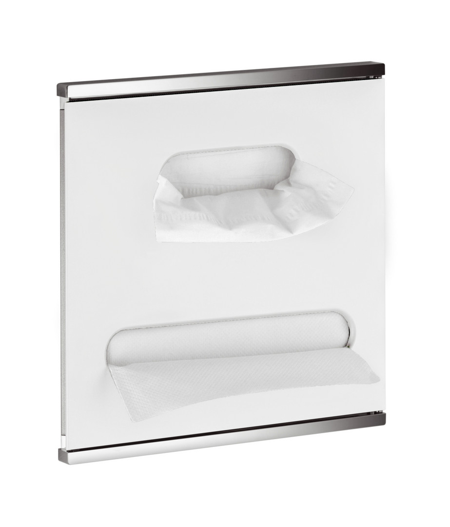 für gefalzte Papiertücher (z-Faltung) geeignet (250 x 230 mm), Aufnahme für Kleenexbox, Betätigung von vorne, Befüllung durch abschließbare Fronttür, Einbaukorpus aus verzinktem Stahlblech, Einbautiefe 125 mm, verdeckte Befestigung, mit Befestigungs-Set