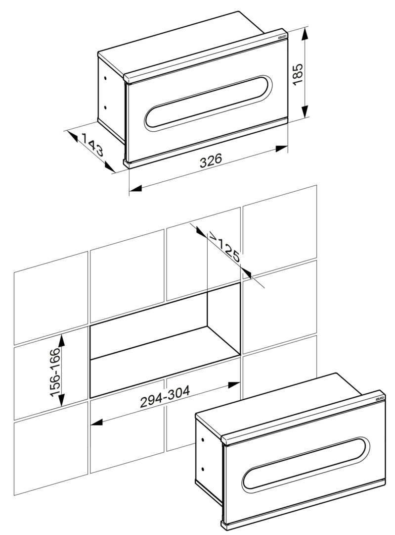 für gefalzte Papiertücher (z-Faltung) geeignet (250 x 230 mm), Betätigung von vorne, Befüllung durch abschließbare Fronttür, Einbaukorpus aus verzinktem Stahlblech, Einbautiefe 125 mm, verdeckte Befestigung, mit Befestigungs-Set