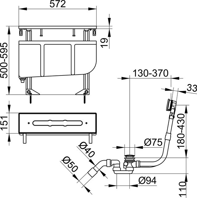 Wannenrandmontage, Montageblock mit Leckwasserbehälter und Ablaufschlauch, mit Ab- und Überlaufgarnitur mit Füllfunktion G 1 1/2, Anschlussart Eckventile G 1/2