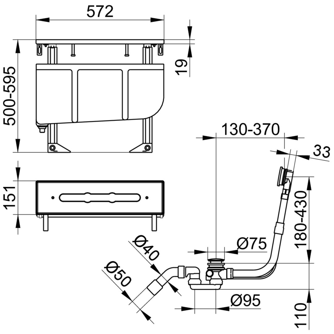 Wannenrandmontage, Montageblock mit Leckwasserbehälter und Ablaufschlauch, mit Ab- und Überlaufgarnitur G 1 1/2, Anschlussart Eckventile G 1/2