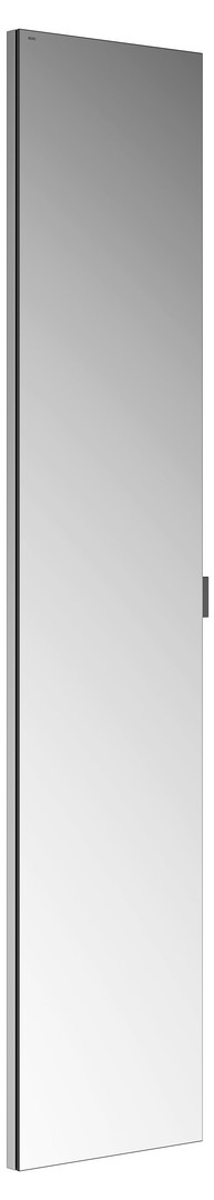 1 Drehtür aus Kristall-Doppelspiegel, Korpus Aluminium silber-gebeizt-eloxiert, Rückwand aus rückseitig weiß lackiertem Glas, unbeleuchtet, höhenverstellbare Glasablagen: 3x bei Schrankhöhe 700 mm/4x bei Schrankhöhe 900 mm