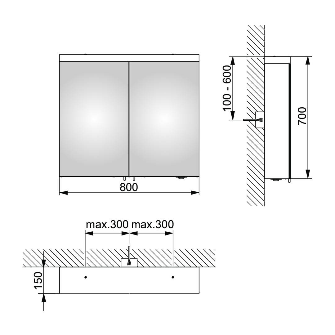 Drehtüren aus Kristall-Doppelspiegeln mit Anschlagsdämpfung, Korpus: Aluminium (silber-gebeizt-eloxiert), Seiten verspiegelt, Rückwand grau, Bedienung: außenliegender Drehdimmer, Funktionen: ein-/ausschalten, stufenlos dimmen, Wechsel zwischen 3 Beleuchtungsarten, integrierte Nebenstellenfunktion (Raumschalter), Lichtfarbe: 3000 Kelvin (warmweiß), Oberleuchte mit direkter Beleuchtung, indirekte Waschtischbeleuchtung, LED, Ausstattung: 2x innenliegende Steckdose, 3x höhenverstellbare Glasablage