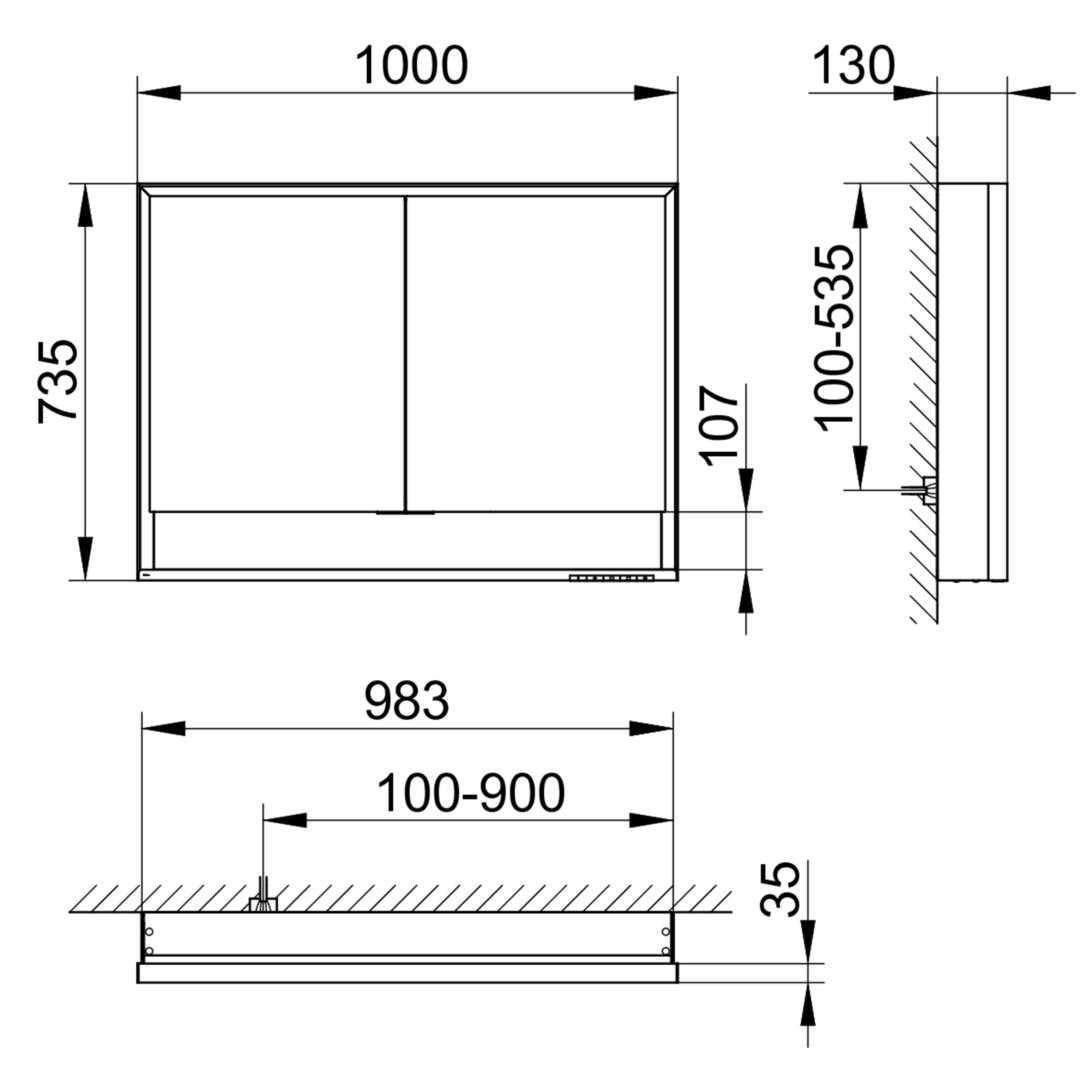 Schutzart IP 24, Drehtür aus Kristall-Doppelspiegel mit Anschlagsdämpfung, Korpus Aluminium silber-eloxiert, Korpusseite Spiegel, Korpusrückwand Spiegel, Bedienfeld mit kapazitiver Touch-Sensorik, ein-/ausschalten, stufenlos dimmbar, Einstellen der Lichtfarbe, integrierte Nebenstellenfunktion (Raumschalter), Beleuchtung 2700 Kelvin (warmweiß) bis 6500 Kelvin (tageslichtweiß), vertikal und horizontal (nur oben), Waschtisch-/Fachbeleuchtung, Innenraumausleuchtung, LED, 55/56/58/60/61 W, Ausstattung 2 Steckdosen, 2x 2 höhenverstellbare Glasböden, offenes Ablagefach über die ganze Breite, Spiegelheizung mittig des Spiegels platziert, optische Anzeige der Aufheizphase, automatische Abschaltung nach 20 Minuten, 60 W