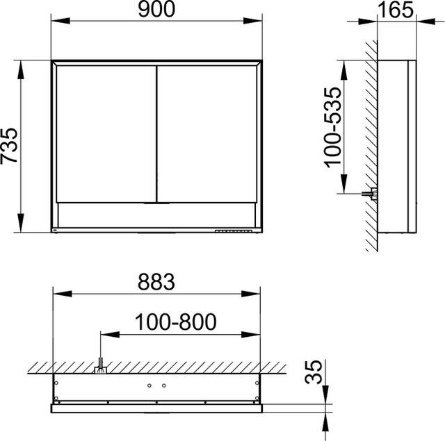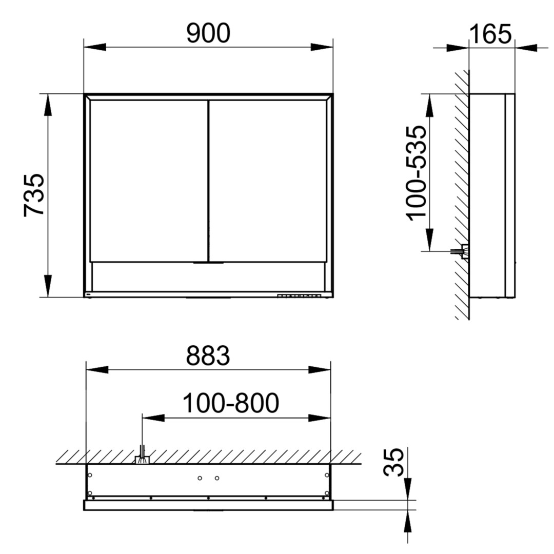 Schutzart IP 24, Drehtür aus Kristall-Doppelspiegel mit Anschlagsdämpfung, Korpus Aluminium silber-eloxiert, Korpusseite Spiegel, Korpusrückwand Spiegel, Bedienfeld mit kapazitiver Touch-Sensorik, ein-/ausschalten, stufenlos dimmbar, Einstellen der Lichtfarbe, integrierte Nebenstellenfunktion (Raumschalter), Beleuchtung 2700 Kelvin (warmweiß) bis 6500 Kelvin (tageslichtweiß), vertikal und horizontal (nur oben), Waschtisch-/Fachbeleuchtung, Innenraumausleuchtung, LED, 55/56/58/60/61 W, Ausstattung 2 Steckdosen, 2x 2 höhenverstellbare Glasböden, offenes Ablagefach über die ganze Breite, Spiegelheizung mittig des Spiegels platziert, optische Anzeige der Aufheizphase, automatische Abschaltung nach 20 Minuten, 60 W