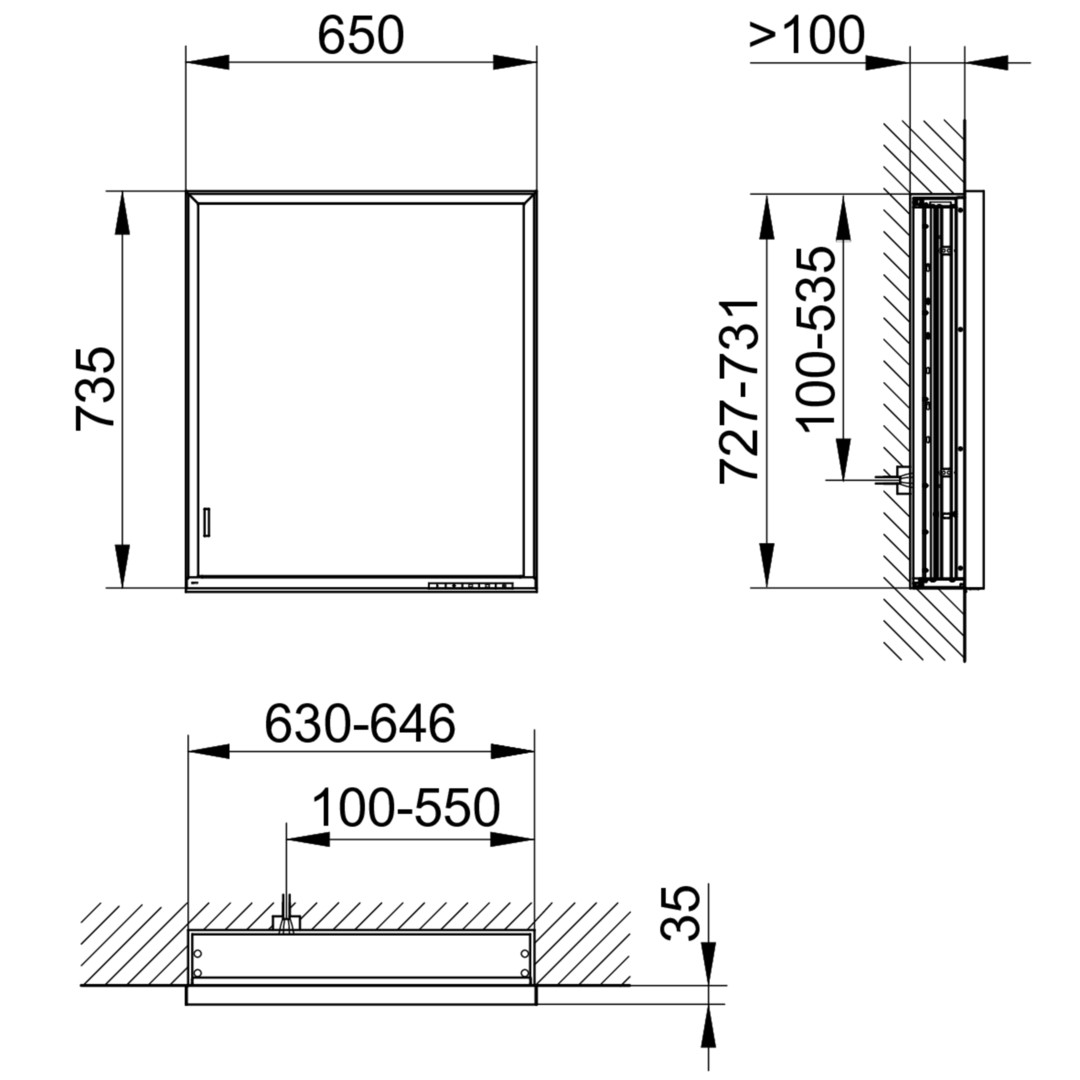 Tiefe vor der Wand 35 mm, Schutzart IP 24, Drehtür aus Kristall-Doppelspiegel mit Anschlagsdämpfung, Korpus Aluminium silber-eloxiert, Korpusseite Aluminium silber-eloxiert, Korpusrückwand Spiegel, Bedienfeld mit kapazitiver Touch-Sensorik, Funktion ein-/ausschalten, stufenlos dimmbar, Einstellen der Lichtfarbe, integrierte Nebenstellenfunktion (Raumschalter), Beleuchtung 2700 Kelvin (warmweiß) bis 6500 Kelvin (tageslichtweiß), vertikal und horizontal (nur oben), Waschtisch- / Fachbeleuchtung, Innenraumausleuchtung, LED, 1 innenliegende Steckdose, 2 höhenverstellbare Glasablagen, verdecktes Ablagefach über die ganze Breite
