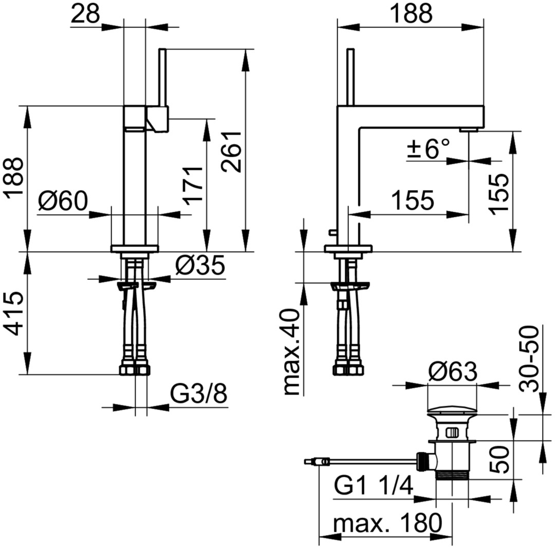 Auslaufhöhe 155 mm, Einlochmontage mit Schnell-Montage-System, Anschlussart Anschlussschläuche G 3/8, Mischwasserkartusche mit keramischen Dichtscheiben, Luftsprudler M 24x1, Strahlwinkel +/- 6° verstellbar, Durchflussmenge begrenzt auf 7,6 l/min, für Durchlauferhitzer geeignet, geräuschgeprüft