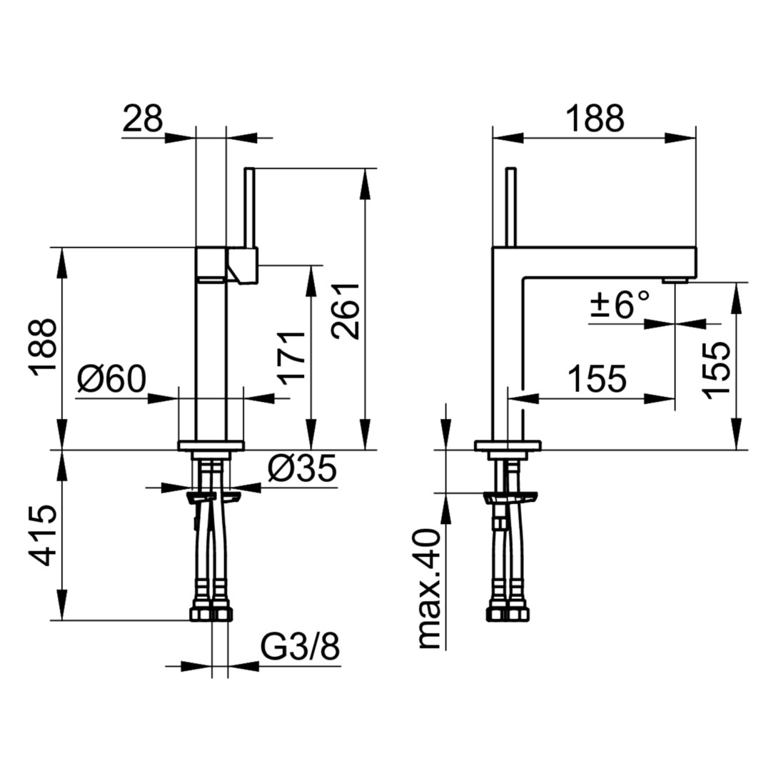 Auslaufhöhe 155 mm, Einlochmontage mit Schnell-Montage-System, Anschlussart Anschlussschläuche G 3/8, Mischwasserkartusche mit keramischen Dichtscheiben, Luftsprudler M 24x1, Strahlwinkel +/- 6° verstellbar, Durchflussmenge begrenzt auf 7,6 l/min, für Durchlauferhitzer geeignet, geräuschgeprüft