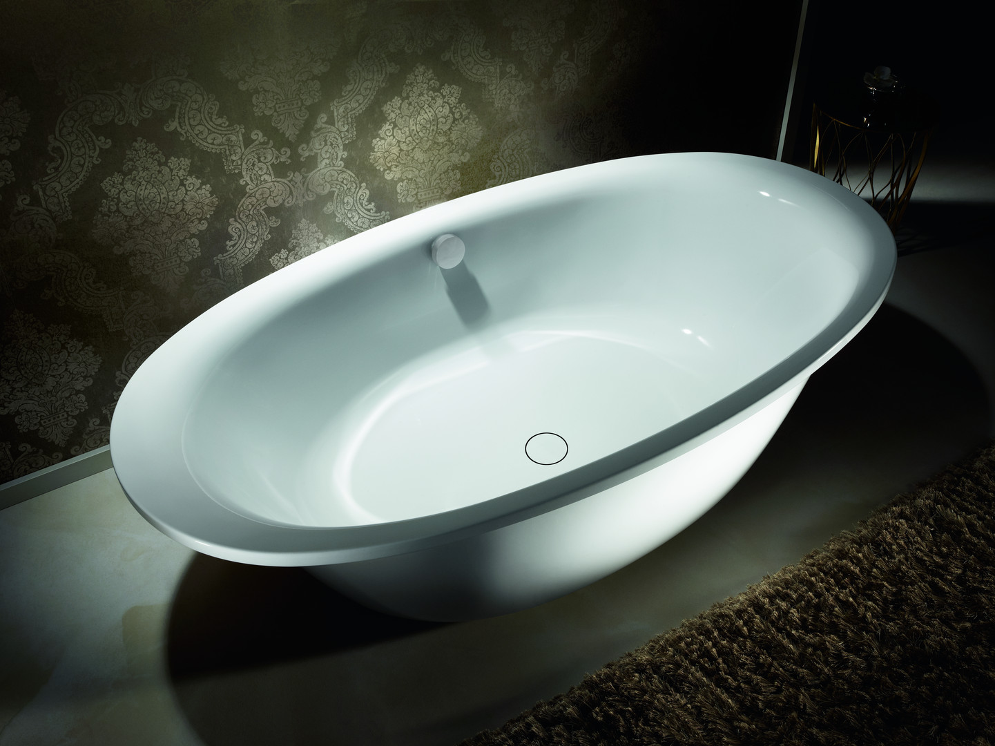 freistehende Badewanne in ovaler Form mit einteiliger Schürze und mittig positioniertem emailliertem Ab-/Überlaufdeckel in Wannenfarbe