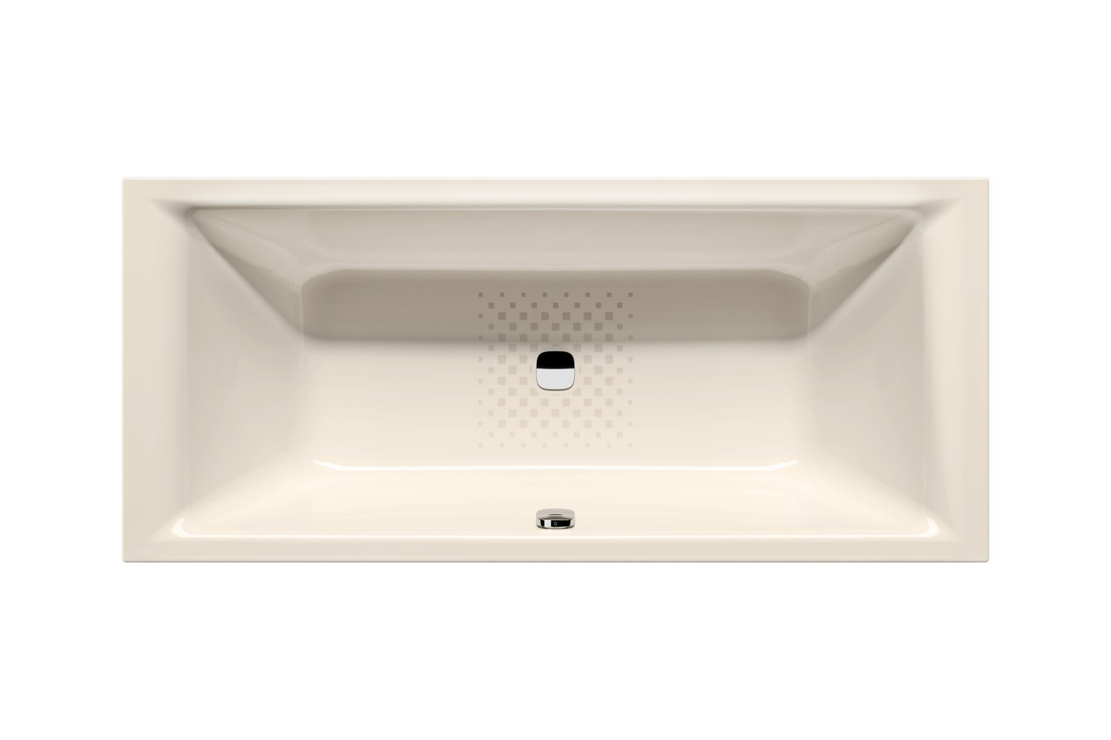 zwei Rückenschrägen und Mittelablauf für das Baden zu zweit, Rückenschrägen mit Komfort-Nackenzone, flacher Wannenrand, Oberfläche aus glasiertem Stahl, mit marktüblichen Garnituren gemäß DIN 232 kompatibel, erhältlich mit zusätzlicher Veredelung INVISIBLE GRIP oder ANTISLIP
