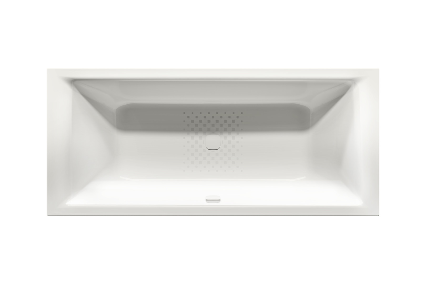 zwei Rückenschrägen und Mittelablauf für das Baden zu zweit, Rückenschrägen mit Komfort-Nackenzone, flacher Wannenrand, Oberfläche aus glasiertem Stahl, mit marktüblichen Garnituren gemäß DIN 232 kompatibel, erhältlich mit zusätzlicher Veredelung INVISIBLE GRIP oder ANTISLIP