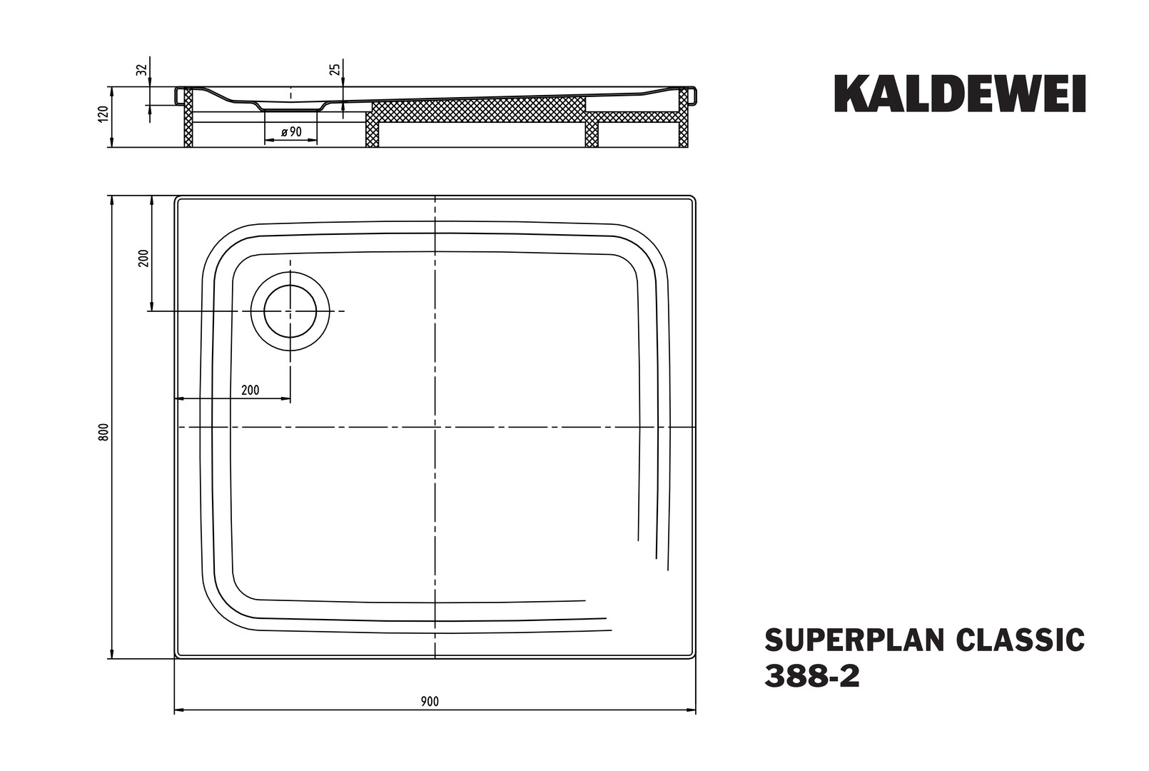 Kaldewei Duschwanne SUPERPLAN CLASSIC 388-2 80x90x2,5cm, mit Träger, alpinweiß matt