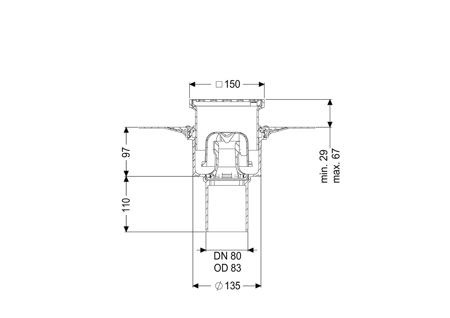bestehend aus Grundkörper mit Auslauf senkrecht, aus Ecoguss resistant, mit Klebeflansch, Geruchsverschluss, Auslaufstutzen für SML-Rohranschluss, Sperrwasserhöhe 50 mm, Kernlichbohr-Maß 160 mm, Aufsatzstück aus ABS, Schlitzrost 138 x 138 mm, aus Edelstahl V2A, Klasse K 3, verschraubt