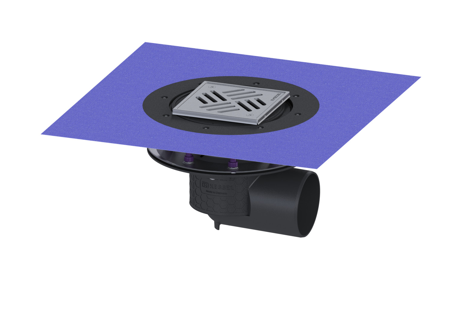 bestehend aus Grundköper mit Auslauf seitlich, Geruchsverschluss, Material PP, Sperrwasserhöhe 50 mm, mit Pressdichtungsflansch, Aufsatzstück für Abdichtung im Verbund aus ABS, mit beiliegender Dichtmanschette, Schlitzrost 138 x 138 mm, Rahmen aus Edelstahl V2A, Klasse K 3, verschraubt