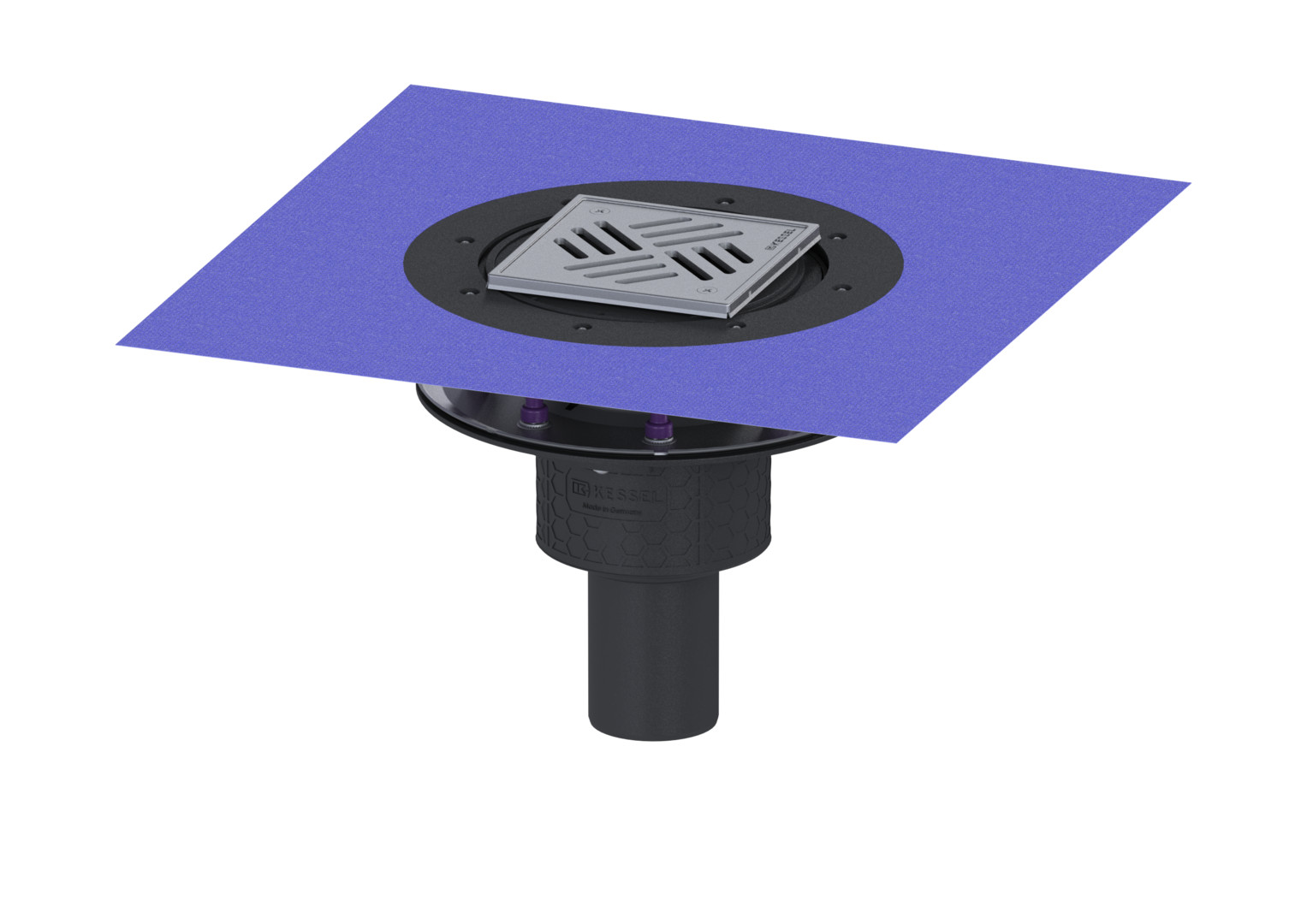 bestehend aus Grundköper mit Auslauf senkrecht, Geruchsverschluss, Material PP, Sperrwasserhöhe 50 mm, mit Pressdichtungsflansch, Kernlochbohr-Maß 160 mm, Aufsatzstück für Abdichtung im Verbund aus ABS, mit beiliegender Dichtmanschette, Schlitzrost 138 x 138 mm, Rahmen aus Edelstahl V2A, Klasse K 3, verschraubt