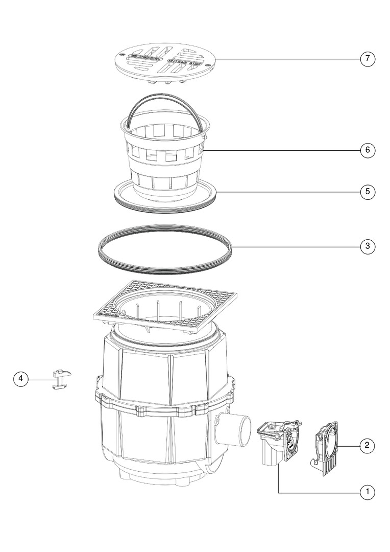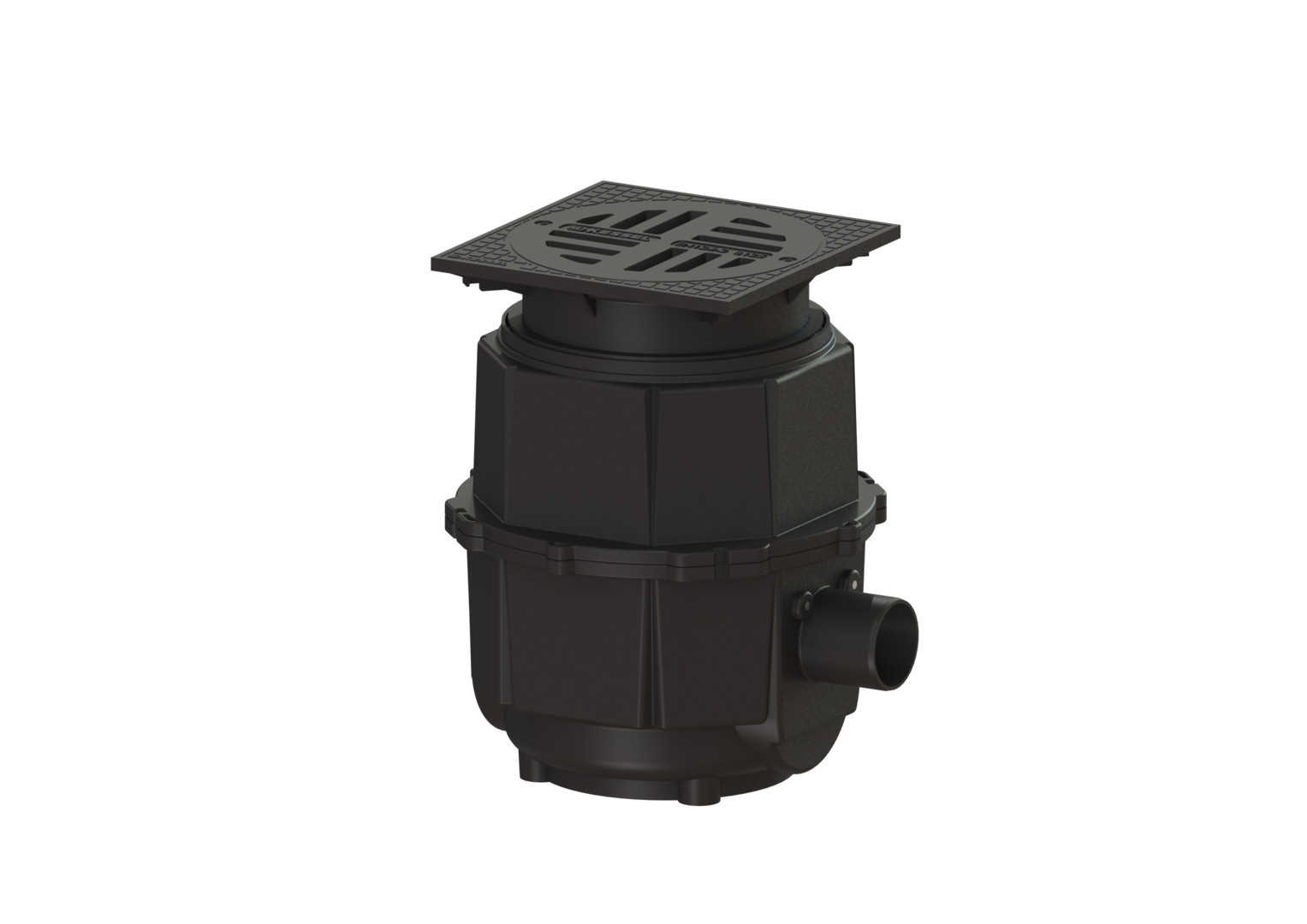 aus Kunststoff, Rückstauverschluss, Geruchsverschluss, Schlammeimer, Aufsatzstück mit Schlitzrost Klasse A, Kunststoff, 400 x 400 mm, Klasse B, Guss, 400 x 400 mm, Klasse D, Guss, 450 x 450 mm, Abflussleistung 3,1 l/s, Aussparungsmaße 585 × 535 mm