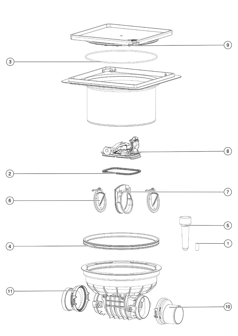 mit 2 Kunststoffklappen, Einbau in die Bodenplatte, teleskopischem Aufsatzstück und Flansch für Abdichtung im Verbund, Einbautiefe DN 90-100 276-399 mm, Einbautiefe DN 125-200 328-450 mm, Aussparungsmaße 750 x 750 mm, Zu-/Auslauf DN 200 Hydraulik entspricht DN 150