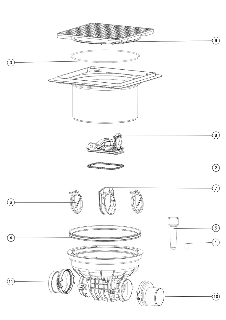 mit 2 Kunststoffklappen, Einbau in die Bodenplatte, teleskopischem Aufsatzstück und Flansch für Abdichtung im Verbund, Einbautiefe DN 90-100 276-399 mm, Einbautiefe DN 125-200 328-450 mm, Aussparungsmaße 750 x 750 mm, Zu-/Auslauf DN 200 Hydraulik entspricht DN 150