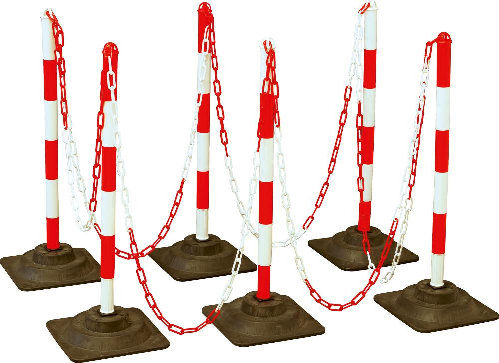 Kettenpfosten-Set EcoMax mit 10 m Absperrkette 3x rot/weiß, 3x weiß/rot, 6x Hartgummifuß