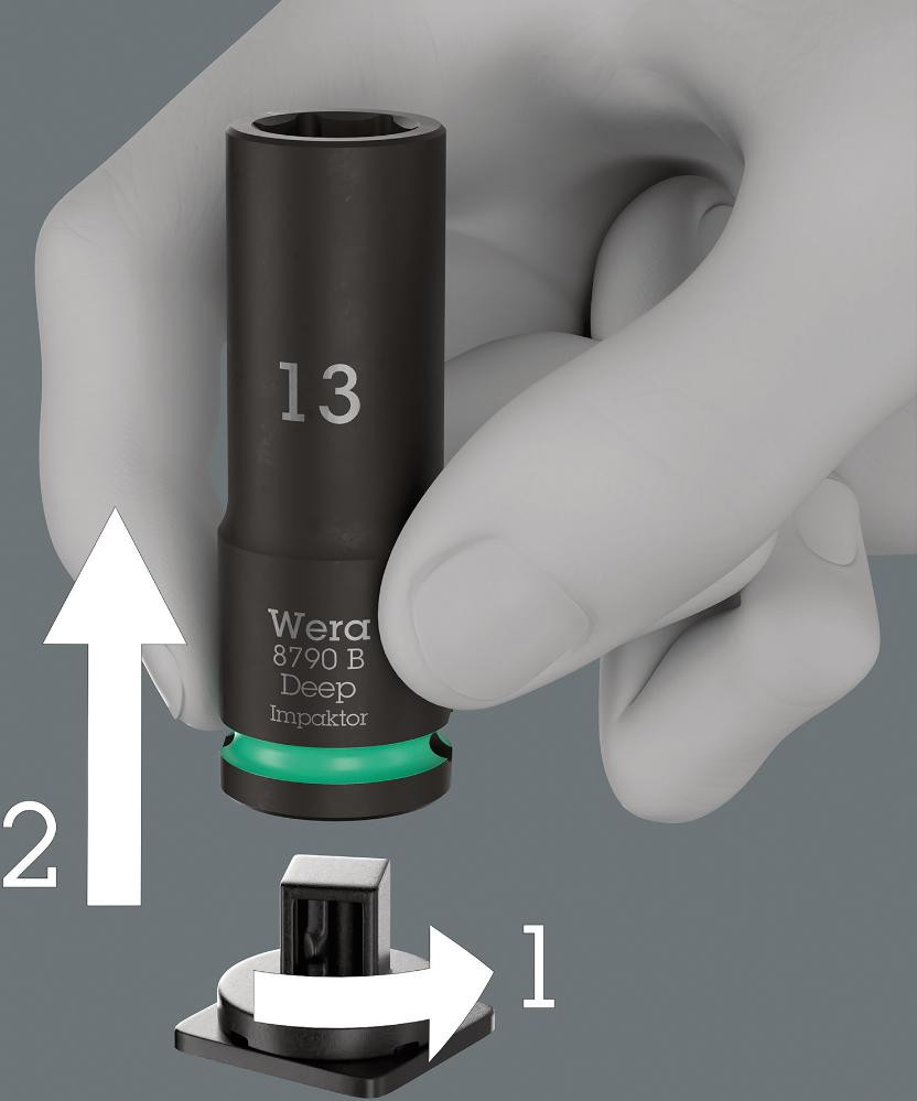 • Sichere Verriegelung der Steckschlüssel-Einsätze per Druckknopf