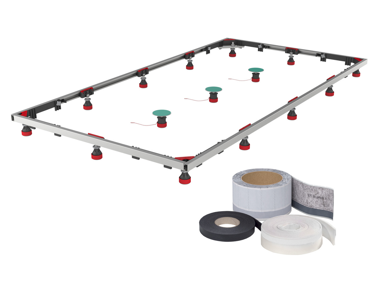 für Duschwannen von 700 x 700 mm bis 1000 x 1800 mm, mit Zubehör höhenverstellbar von 70 mm bis 235 mm, ADS (Anti-Dreh & Schallschutz-System), schallgedämmte Wannenrandabstützung, Wannenrandabdichtung nach DIN 18534, mit Zubehör (Art.-Nr. 150 198) Höhenverstellung auf 55 mm reduzierbar, mit Zubehör (Art.-Nr. 150 171) Höhenverstellung auf 235 mm erweiterbar, mit Zubehör 150 197) erweiterbar auf Einbausituation mit einem an der Wand verlaufenen Ablaufrohr, Schallschutz-Set (Art.-Nr. 150 264, besteht aus 1x Montagerahmen (12 höhenverstellbare Schraubfüße, 3x EasyLift, 1x Ecktraverse, 4x Bodenlaschen, Befestigungsmaterial, 12x Adapterhülsen (25 mm Erhöhung), 12x Adapterhülsen (50 mm Erhöhung)), 15x ADS-Kappen mit Sylomerunterlage, 1x Rolle Aquaproof (Länge 4,00 m, Butyldichtband, beidseitig klebend), 1x Rolle Schalldämmstreifen (Länge 4,00 m), 1x Rolle Fliesentrennstreifen (Länge 4,00 m, selbstklebend)