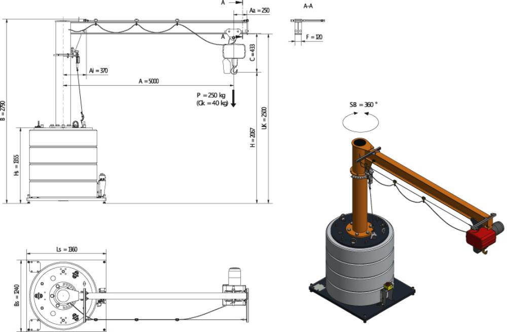 Mobiler Säulenschwenkkran 250kg,5,0m,360 MOBILUS+Elektrokettenzug MOB12-PR2,5-5,0