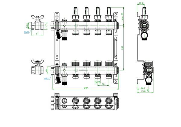 OVENTROP-Edelstahlverteiler 0-5 l/min., für 4 Kreise