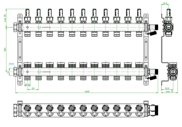 Oventrop Heizkreis-Verteiler Multidis SF 11 Kreise, mit Durchfluss-, Mess- und Reguliereinsätzen im Vorlauf