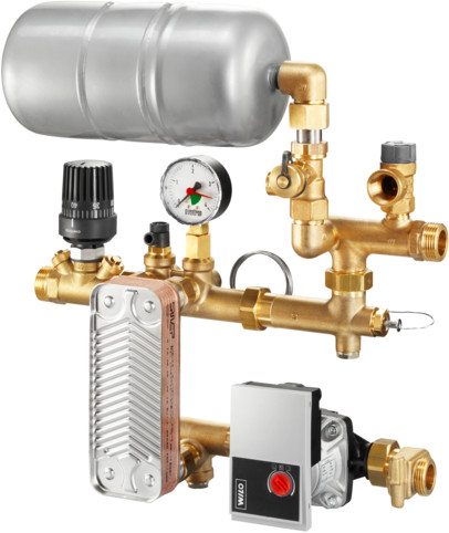 zur Vorlauftemperaturregelung von Flächenheizungen, mit Wärmeübertrager, Festwertregelstation für den Betrieb von nicht diffusionsdichten Flächenheizungssystemen in Heizungsanlagen (getrennte Kreisläufe), Montage linksseitig vor Verteiler, 2-12 Heizkreisanschlüsse, Betriebsdruck Primärstufe: max. 6 bar, Sekundärstufe: max. 3 bar, Vorlauftemperatur Primärseite: max. 90 °C, Sekundärseite: max. 50 °C, Reglereinstellbereich: 20-50 °C, vormontierte und geprüfte Festwertregelstation mit elektronischer Grundfos-Pumpe Alpha (Gehäuse aus Rotguss), Wärmeübertrager, Membranausdehnungsgefäß (3 l), Manometer, Sicherheitsventil