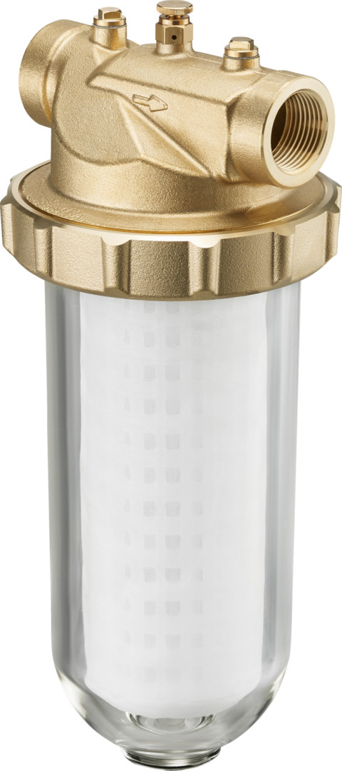 für industrielle Anwendung, Kopfstück und Überwurfmutter aus Messing, Filtereinsatz Kunststoffstützkörper mit Gewebe, Wassertemperatur: max. 30 °C, mit Klarsichtkunststofftasse (Trogamid T), PN 16, IG EN 10226-1