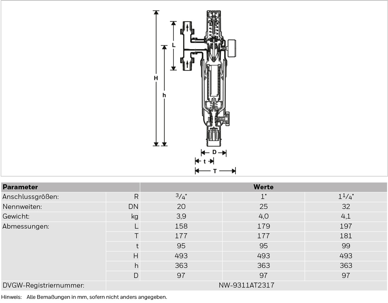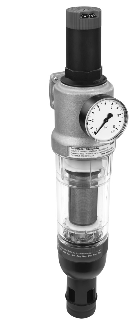 rückspülbarer Feinfilter und Druckminderer in einem Gerät integriert, ununterbrochene Sicherung der Wasserversorgung mit gefiltertem Wasser, der Feinfilter verhindert das Einspülen von Fremdpartikeln und reduziert so die Korrosionswahrscheinlichkeit, der Druckminderer vermeidet Druckschäden und senkt den Wasserverbrauch, alle Einzelgeräte entsprechen den Anforderungen der jeweils gültigen DIN/DVGW Vorgabe, Merkmale die für die Einzelgeräte gelten, sind auch für die Hauswasser-Station gültig, Double Spin Technology, Kartusche mit außenliegendem Rotor (dadurch gleichzeitige Reinigung von unterem und oberem Filterbereich, visuelle Funktionskontrolle möglich), während der Rückspülung Versorgung mit gefiltertem Wasser, Memory-Ring als Hinweis auf die nächstfällige manuelle Rückspülung, Rückspülautomatik mit Bajonett-Anschluss nachrüstbar, Filtertasse aus Kunststoff ermöglicht eine Kontrolle der Filterverschmutzung, Vordruckkompensation - schwankende Vordrücke haben keinen Einfluss auf den Hinterdruck, Ventil- und Filtereinsatz komplett austauschbar, große Filterfläche, komplette Filtertasse austauschbar, normierter Ablaufanschluss, alle Materialien gemäß KTW, von TÜV LGA als geräuscharm zugelassen - Gruppe 1 ohne Einschränkungen, Zertifizierungen DVGW (Zulassung für alle Filter mit 100 µm Filterfeinheit), Medium Trinkwasser, Ventilkörper aus Rotguss, Federhaube aus Kunststoff, Anschlussdurchmesser 1", Nennweite DN 25 mm, max. Mediumstemperatur 30 °C, Nenndurchfluss 6 cbm/h, Filtereinheit 100 µm, Druck-Bereich 1,5-6 bar, Einstellskala ja, entlastetes Einsitzventil ja, Rückspülung mit gefiltertem Wasser ja, Einbaulage horizontal oder vertikal