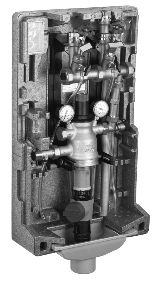für Ein- und Mehrfamilienhäusern bis 4 Parteien, kompakt, integrierter Rückflussverhinderer, rückspülbarer Filter, Druckminderer, Trinkwasserverteilung für Speicher- und Trinkwasserinstallation und Speichersicherheitsgruppe, modularer Aufbau, vorbereitet für Anschluss einer Wasserhärtungseinheit, vorbereitet für Anschluss einer Heizungsbe- und nachfülleinheit, erweiterbar um zusätzliche Kaltwasseranschlüsse, beide Manometer der Filterkombination sowie der Ablaufschlauch des Sicherheitsventils durch transparentes Sichtfenster einsehbar, roter Zeiger zur Einstellung der nächsten Rückspülung auf dem Sichtfenster, 3-Punkt-Montagesystem um Unebenheiten und schräge Wände ausgleichen zu können, Anschluss der Versorgungsleitung bedarfsabhängig wechselbar von Links- auf Rechtsanschluss, Anschlussmöglichkeit für Probenahmeventil vorhanden, Vor- und Hinterdruckmanometer endwertbelastbar, Sicherheitsventil 6 bar im Lieferumfang enthalten, Bezeichnungsschilder im Lieferumfang enthalten, alle Komponenten DVWG-zertifiziert, Medium Trinkwasser, Ventilkörper aus entzinkungsbeständigem Messing, Federhaube aus Kunststoff, Rohranschluss Innengewinde, Anschlussdurchmesser 3/4", Nennweite DN 20 mm, max. Mediumstemperatur 30 °C, stat. Druck PN 16, Nenndurchfluss (cbm/h) 4,2, Filterfeinheit 100 µm, Druckbereich 1,5-6 bar, Einstellskala nein, entlastetes Einsitzventil ja, Einbaulage horizontal