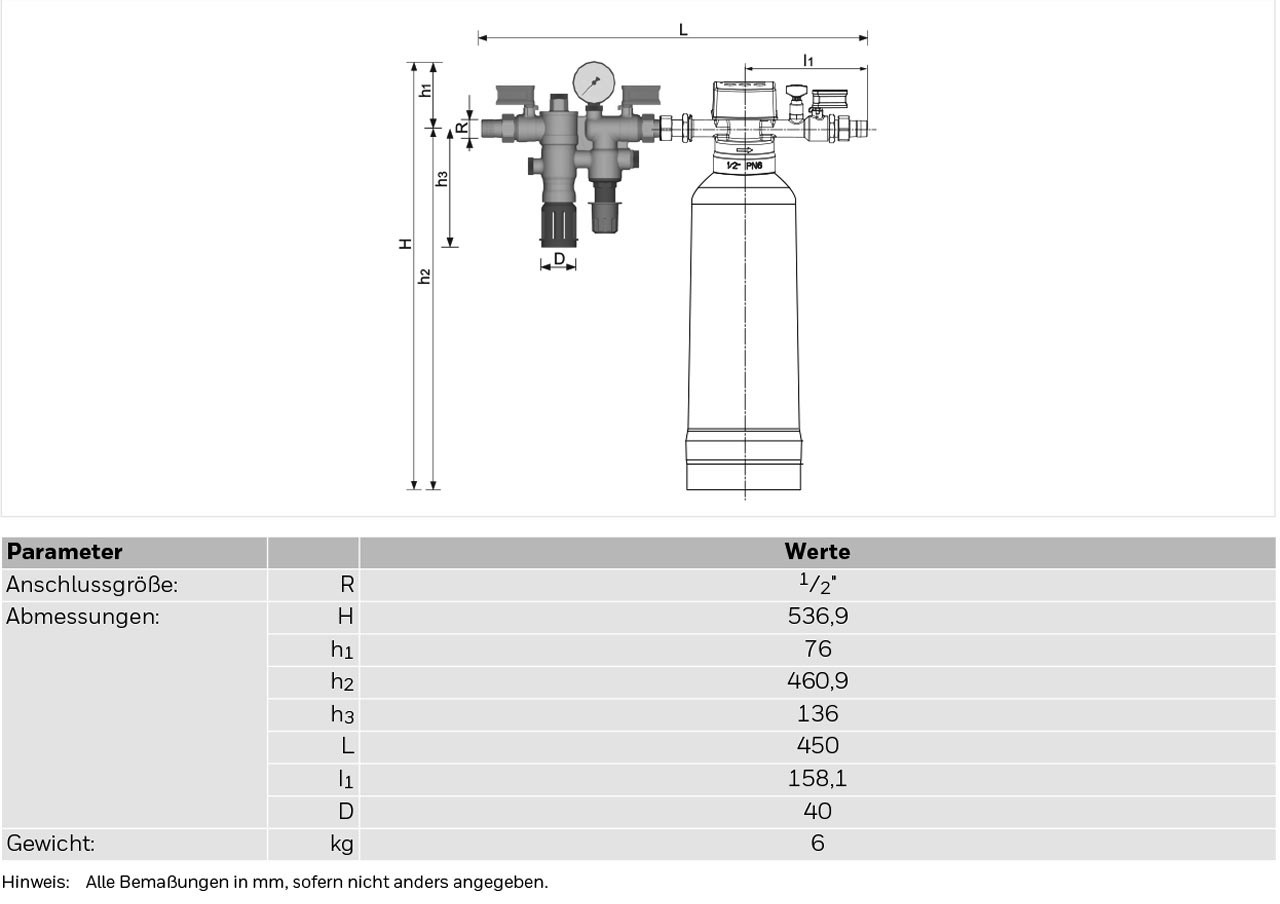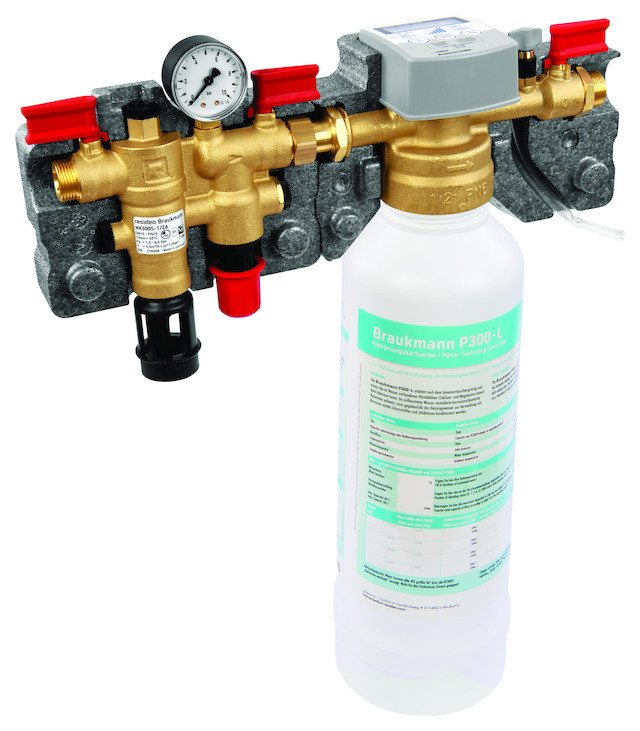 ermöglicht die Enthärtung von Heizungswasser nach den anerkannten Regeln der Technik, Kalkablagerungen und damit einhergehende Schäden und Funktionsstörungen in Warmwasserheizungsanlagen werden verhindert, die vorgeschaltete (auf einem Systemtrenner Typ BA basierte Nachfüllkombination) schützt das Trinkwasser vor rückfließendem Heizungswasser wie in der DIN EN 1717 gefordert, Gehäuse aus entzinkungsbeständigem Messing, Ablaufanschluss, Kartuscheneinsatz, Ventileinsatz, mechanische Komponenten der Verschneideeinheit und Federhaube aus hochwertigem Kunststoff, Membrane aus EPDM, gewebeverstärkt, Dichtelemente aus NBR und EPDM, Sollwertfeder aus Federstahl, Feinsieb aus nichtrostendem Stahl, Patrone aus Polypropylen, Dämmschale EPP, Medium Wasser (Frischwasser Härtebereich 0 °dH-26 °dH), max. Mediumstemperatur 30 °C, Flüssigkeitskategorie (EN 1717) Kategorie 4, Kvs-Wert 0,3, Filterfeinheit 200 µm, Druckbereich 1,5-4 bar, horizontale Einbaulage
