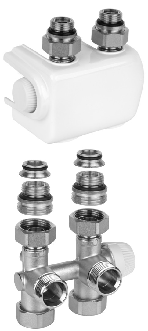 Universalventil für alle Heizkörperverbindungsstellen 1/2"-Innengewinde, 3/4"-Außengewinde mit Euroconus gemäß EN 16313, 3/4"-Außengewinde mit Flachdichtung, Universalventil für Rohre, die von der Wand weg verlaufen (abgewinkelt), sowie für Rohre, die vom Boden weg verlaufen (gerade), Lieferung in abgewinkelter Ausführung, Universalventil für die Zuführung auf der linken und auf der rechten Seite, Thermostateinsätze wurden für Durchfluss in beide Richtungen entworfen, Zweirohr-Versionen sind mit dem voreinstellbaren VS-Einsatz ausgestattet, Einrohr-Versionen sind mit dem UBG-Einsatz für einen hohen Durchfluss und mit einer Schraube für die Einstellung des Bypass-Durchflusses ausgestattet, Funktionen sind thermostatische Steuerung, Voreinstellung, Absperrung, Einstellung des Durchflussanteils (Einrohr), Lieferung mit weißer oder verchromter Abdeckung, Medium Heizwasser, Mediumstemperatur bis 90 °C, PN 10, Rohranschluss AG, Einbauort Vorlauf und Rücklauf, Nennweite DN 15 mm, max. Betriebsdruck 10 bar