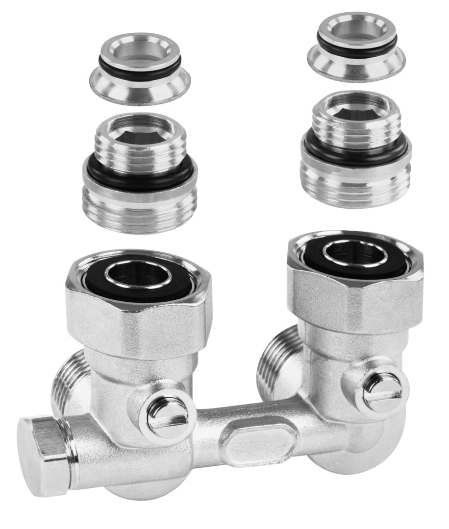 voreinstellbare Absperrverschraubung, für Kompaktheizkörper mit einem eingebauten Thermostateinsatz und mit einem Mittenabstand von 50 mm, die Verschraubung verfügt über einen einstellbaren Bypass, außerdem verfügt der Anschlussblock über Absperrkugelhähne für Vor- und Rücklauf die mit einem Schraubenzieher betätigt werden können, Eck-Ausführung für Wandanschluss, Durchgang-Ausführung für Bodenanschluss, Anschluss an Heizkörper mit folgenden Schnittstellen: direkt ohne Adapter an Heizkörper mit G 3/4"-Außengewinde und Flachdichtung, für Heizkörper mit G 3/4-Euroconus-Anschluss gemäß EN 16313 über den Euroconus-Adapter mit Flachdichtung, für Heizkörper mit G 11/2-Innengewinde über den Reduziernippel von G 3/4 auf G 1/2, auf der Rohrseite ist die Heizkörperverschraubung mit einer G 3(4-Euroconus-Verbindungsstelle gemäß EN 16313 ausgestattet, Durchflussrichtung beliebig, Durchflusskennlinien gelten für beide Strömungsrichtungen, Ventilkörper aus vernickeltem Messing, Medium Wasser oder Wasser-Glykol-Gemisch gemäß VDI-Richtlinie 2035, Absperrkugel/Heizkörperanschluss und Überwurfmutter aus Messing, Kugelabdichtung aus PTFE, O-Ringe aus PDM70, Bypass-Einstellschraube und Schutzkappe aus Messing, Abdichtung aus Faserstoff, Mediumstemperatur -10 bis 130 °C, stat. Druck PN 10, Rohranschluss Außengewinde, Heizkörperanschluss G 3/3, Einbauort Vorlauf und Rücklauf, Anschlussgewinde 3/4", Nennweite DN 15, Kvs-Wert 2,4, Einstellbegrenzung ja, Voreinstellung ja, Befüllen/Entleeren nein, Mess-Möglichkeit nein