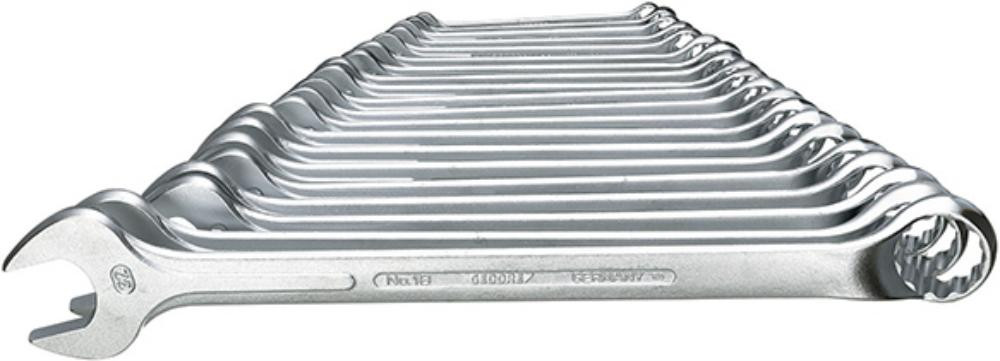 Inhalt: 20 Ring-Maulschlüssel 8; 9; 10; 11; 12; 13; 14; 15; 16; 17; 18; 19; 21; 22; 23; 24; 26; 27; 30; 32 mm.