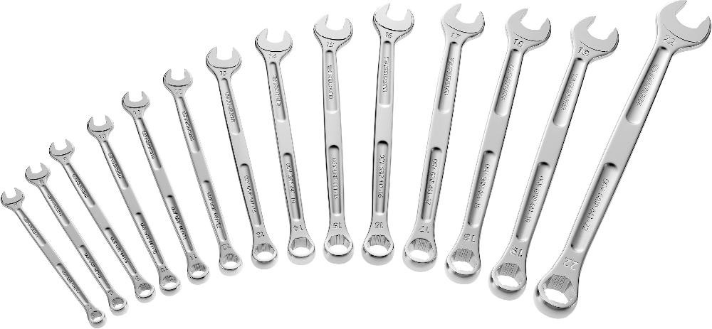 Inhalt: 14 Ring-Maulschlüssel 7; 8; 9; 10; 11; 12; 13; 14; 15; 16; 17; 18; 19; 22 mm.