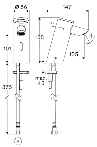 mit 4x AAA Alkalibatterien 1,5 V, berührungslose, sensorgesteuerte Armatur mit innovativer ToF-Technologie, unempfindlich gegenüber reflektierenden Materialien wie z.B. Spiegeln, Warnwesten etc., mit integrierter Bluetooth-Schnittstelle, parametrierbar über SCHELL App, geeignet zur Vernetzung mit SCHELL Wassermanagement-System SWS, Einstellmöglichkeiten über SCHELL App, Parametrierung über voreingestellte Betriebsmodi (Strom sparen / Wasser sparen / Komfort), individuelle Einstellungen im Expertenmodus (Sensor-Reichweite, Sensor-Messintervall, Personenerkennung, max. Laufzeit, Nachlaufzeit), Stagnationsspülung (Aus / im Intervall / Bedarfsgerechtes Spülen unter Berücksichtigung der Nutzungen / zu festen Terminen )Tag(e), Uhrzeit), Dauerspülung für thermische Desinfektion, Auslösung per App (3 - 10 min), Dauerfluss, Auslösung per App (15 - 600 s), Reinigungsstopp, Auslösung per App oder Nahreflex (Aus / 60 – 360 s), Durchfluss max. 5 l/min druckunabhängig, Fließdruck 1,0 - 5,0 bar, max. Ruhedruck 8 bar, max. Betriebstemperatur 70 °C (80 °C für thermische Desinfektion), Werkstoff Gehäuse Messing, Oberfläche chrom, Anschluss G 3/8 IG, bestehend aus Time-of-Flight-Sensor-Einlocharmatur, Time-of-Flight-Sensor-Elektronik (ToF) mit automatischer Justierung des Sensorbereichs, Axialmagnetventil 6 V mit Vorfilter, versenkter Strahlregler (diebstahlgeschützt), Anschlusskabel 220 mm, mit Steckverbinder 3-polig, Schutzklasse IP 65, flexibler Anschlussschlauch Clean-Fix S G 3/8 IG x 410 mm, mit integriertem Rückflussverhinderer (RV, EN 1717: EB) und Vorfilter, Befestigungsmaterial für Waschtischmontage