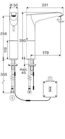 mit 4x AA Alkalibatterien 1,5 V, berührungslose, sensorgesteuerte Armatur mit innovativer ToF-Technologie, unempfindlich gegenüber reflektierenden Materialien wie z.B. Spiegeln, Warnwesten etc., mit integrierter Bluetooth-Schnittstelle,parametrierbar über SCHELL App, geeignet zur Vernetzung mit SCHELL Wassermanagement-System SWS, Einstellmöglichkeiten über SCHELL App, Parametrierung über voreingestellte Betriebsmodi (Strom sparen / Wasser sparen / Komfort), iIndividuelle Einstellungen im Expertenmodus (Sensor-Reichweite, Sensor-Messintervall, Personenerkennung, max. Laufzeit, Nachlaufzeit), Stagnationsspülung (Aus / im Intervall / Bedarfsgerechtes Spülen unter Berücksichtigung der Nutzungen / zu festen Terminen (Tag(e), Uhrzeit), Dauerspülung für thermische Desinfektion, Auslösung per App (3 - 10 min), Dauerfluss, Auslösung per App (15 - 600 s), Reinigungsstopp, Auslösung per App oder Nahreflex (Aus / 60 – 360 s), Durchfluss max. 5 l/min druckunabhängig, Fließdruck 1,0 - 5,0 bar, max. Ruhedruck 8 bar, max. Betriebstemperatur 70 °C (80 °C für thermische Desinfektion), Werkstoff Gehäuse Messing, Oberfläche chrom, Anschluss G 3/8 IG, bestehend aus Time-of-Flight-Sensor-Einlocharmatur, Time-of-Flight-Sensor-Elektronik (ToF) mit automatischer Justierung des Sensorbereichs, Axialmagnetventil 6 V mit Vorfilter, versenkter Strahlregler (diebstahlgeschützt), Anschlusskabel 360 mm, mit Steckverbinder 3-polig, Schutzklasse IP 65, flexibler Anschlussschlauch Clean-Fix S G 3/8 IG x 500 mm, mit integriertem Rückflussverhinderer (RV, EN 1717: EB) und Vorfilter, Befestigungsmaterial für Waschtischmontage