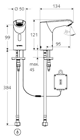 Hochdruck Kaltwasser/vorgemischtes Wasser, Infrarot-Sensor gesteuert, Batteriebetrieb, geeignet zur Vernetzung mit Wassermanagement-System SWS, parametrierbar über Single Control SSC, mit Infrarot-Sensor-Einlocharmatur, Infrarot-Sensor-Elektronik, programmierbar, Axialmagnetventil 6 V mit Vorfilter, Strahlregler, Anschlusskabel 250 mm, mit Steckverbinder 3-polig, Schutzklasse IP 65, Batteriefach 6 V, Schutzklasse IP 65, 4x AA Alkalibatterien 1,5 V, flexibler Anschlussschlauch Clean-Fix S G 3/8 IG x 400 mm, mit integriertem Rückflussverhinderer (RV, EN 1717: EB) und Vorfilter, Befestigungsmaterial für Waschtischmontage, Einstellmöglichkeiten über SWS/SSC: Programmierung über Nahreflex (Aus/Ein), Sensor-Reichweite (kurz/mittel/lang), max. Laufzeit (1-360 s), Nachlaufzeit (0,6-60 s), Stagnationsspülung (Aus/5-600 s, alle 1-240 h nach letzter Spülung/alle 1-240 h), Dauerspülung für thermische Desinfektion, mit Verbrühungsschutz (Aus/15-600 s), Dauerfluss (Aus/15-600 s), Energiesparmodus (Aus/1-254 h nach letzter Nutzung), Reinigungsstopp (Aus/60-360 s), Einstellmöglichkeiten über Nahreflex: Sensor-Reichweite (kurz/mittel/lang), Stagnationsspülung (Aus/30 s, alle 24 h nach letzter Spülung/alle 24 h), Dauerspülung für thermische Desinfektion, mit Verbrühungsschutz (Aus/300 s/120 s), Reinigungsstopp (Aus/60 s), Durchfluss max. 5 l/min druckunabhängig, Fließdruck 1,0-5,0 bar, max. Ruhedruck 8 bar, max. Betriebstemperatur 70 °C (80 °C für thermische Desinfektion), Gehäuse aus Messing, wasserführende Teile aus Kunststoff, Oberfläche chrom, Anschluss G 3/8 IG, Zertifikate: P-IX 29072/IO, ACS, Belgaqua, WELL public, Geräuschklasse I, Durchflussklasse O