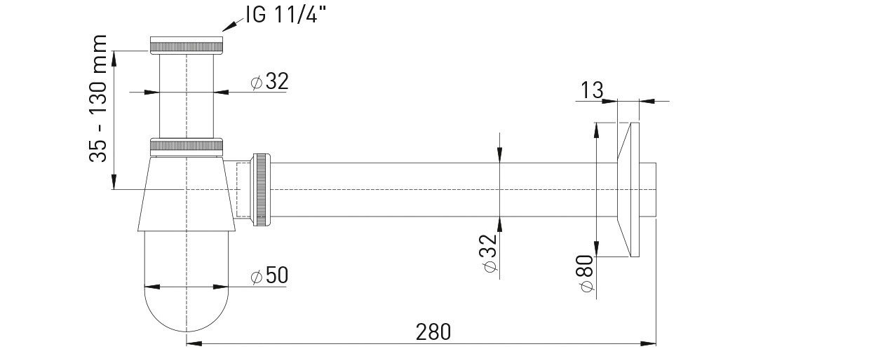 STEDO Flaschengeruchsverschluss 1 1/4" x 32 mm, Verstellrohr 120mm, Messing verchromt