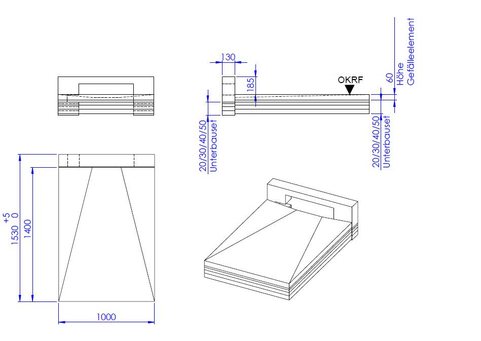 bodeneben, verfliesbar, barrierefrei (Fliesengröße bei Rollstuhlnutzung= 5 x 5 cm), bestehend aus Hartschaum-Gefälleelement mit integriertem Systemgefälle von ca. 2 %, werkseitig abgedichtet nach DIN 18534-1, Wassereinwirkungsklasse W2-I, Unterbauelemente (2/3/4/5 cm) zum Höhenausgleich auf der Baustelle, Adapter